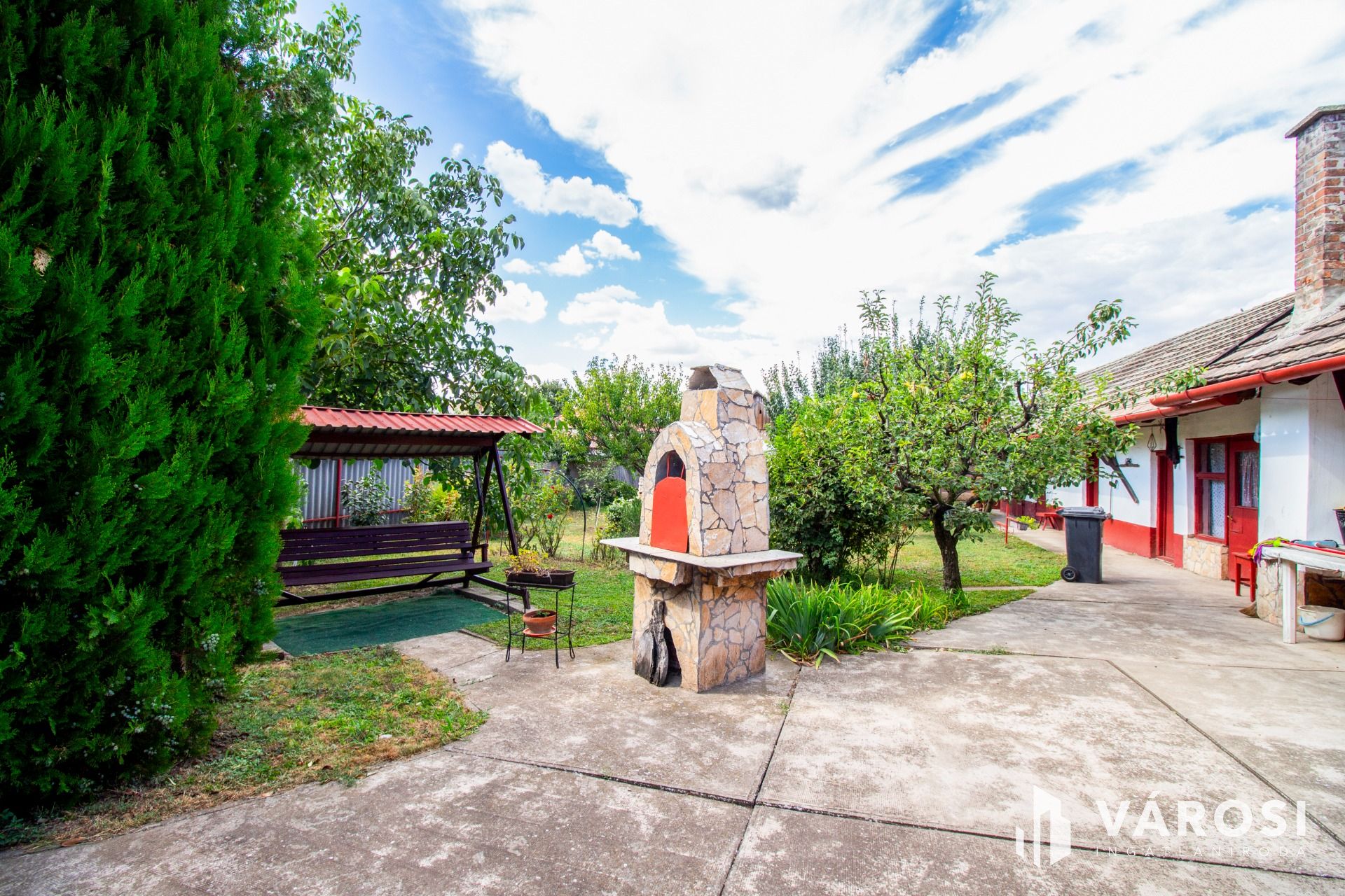 Az udvaron lehetőség van tágas terasz kialakítására, melynek helyét az épület L alakja remekül "adja". Kerti grill, kemence és sütőhely is azonnal az új tulajdonos szabadidejének kellemes eltöltésére ad lehetőséget.