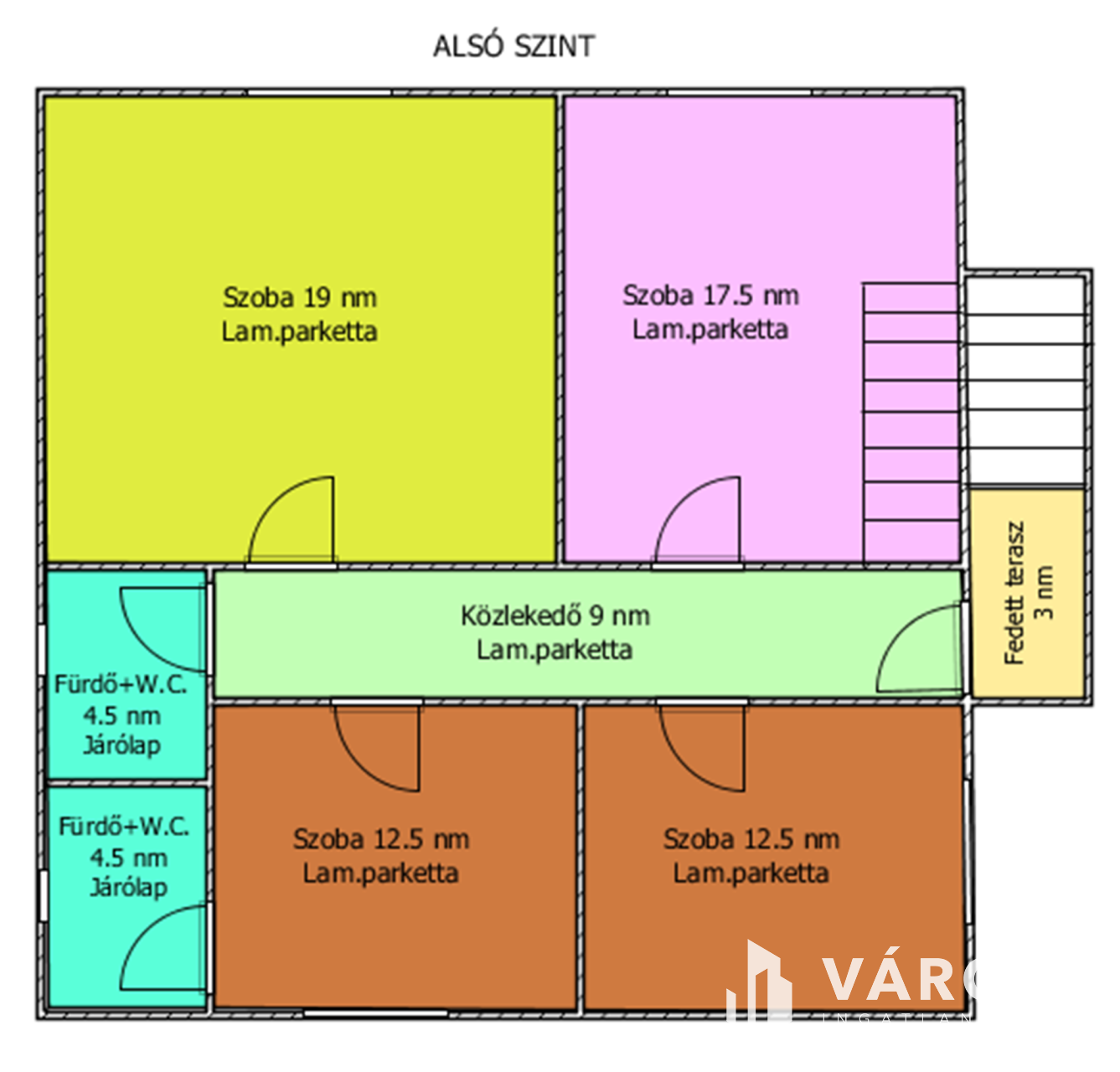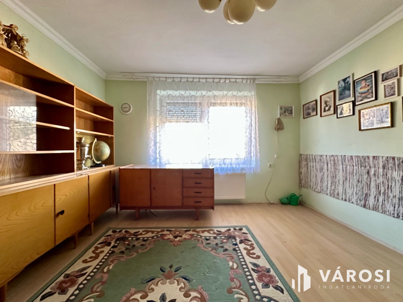 Helyiségei: az alsó szinten konyha, étkező, kamra, külön nyíló W.C., közlekedő, kazánház, garázs (elektromos kapuval), a felső szinten 4 szoba, közlekedő, 2 fürdőszoba.