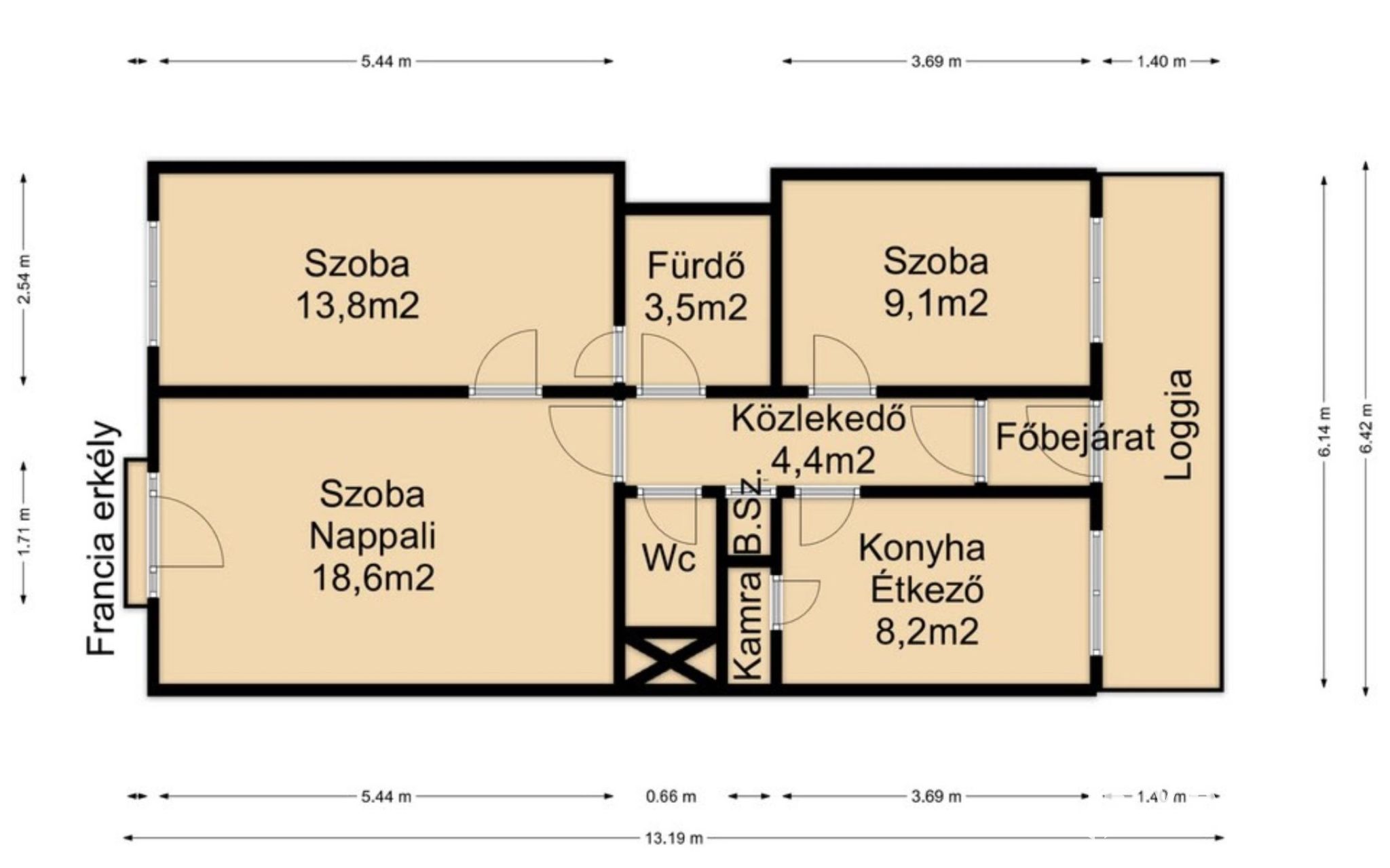 Az ingatlan szélső lakás ezért az előtte található Loggia, saját használatú.