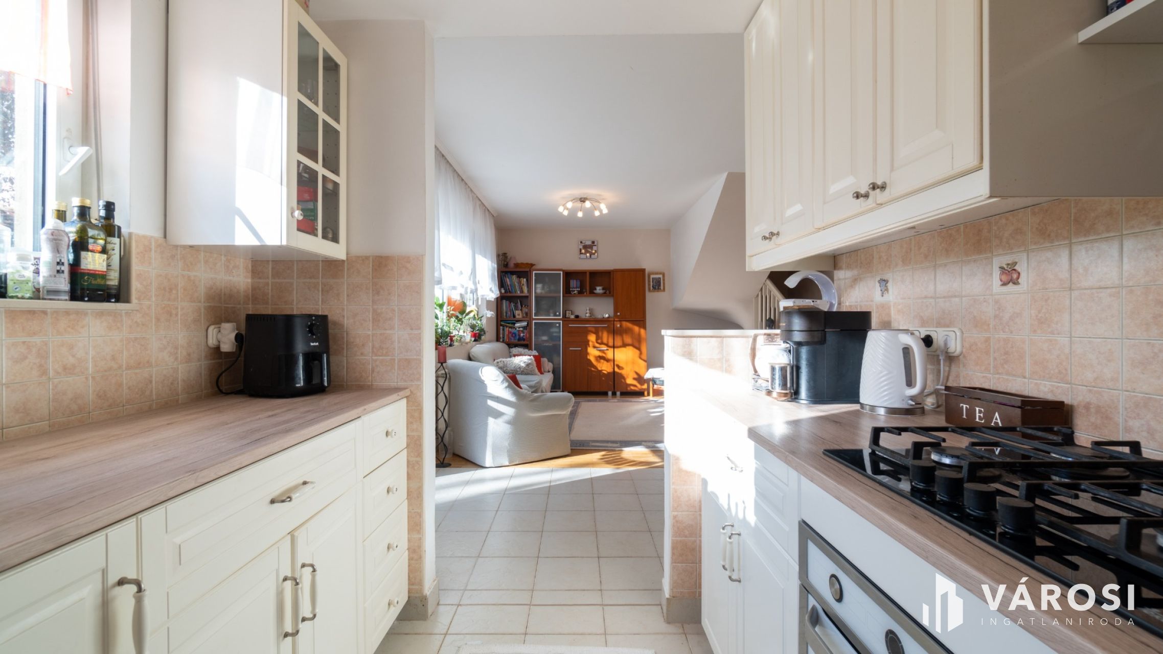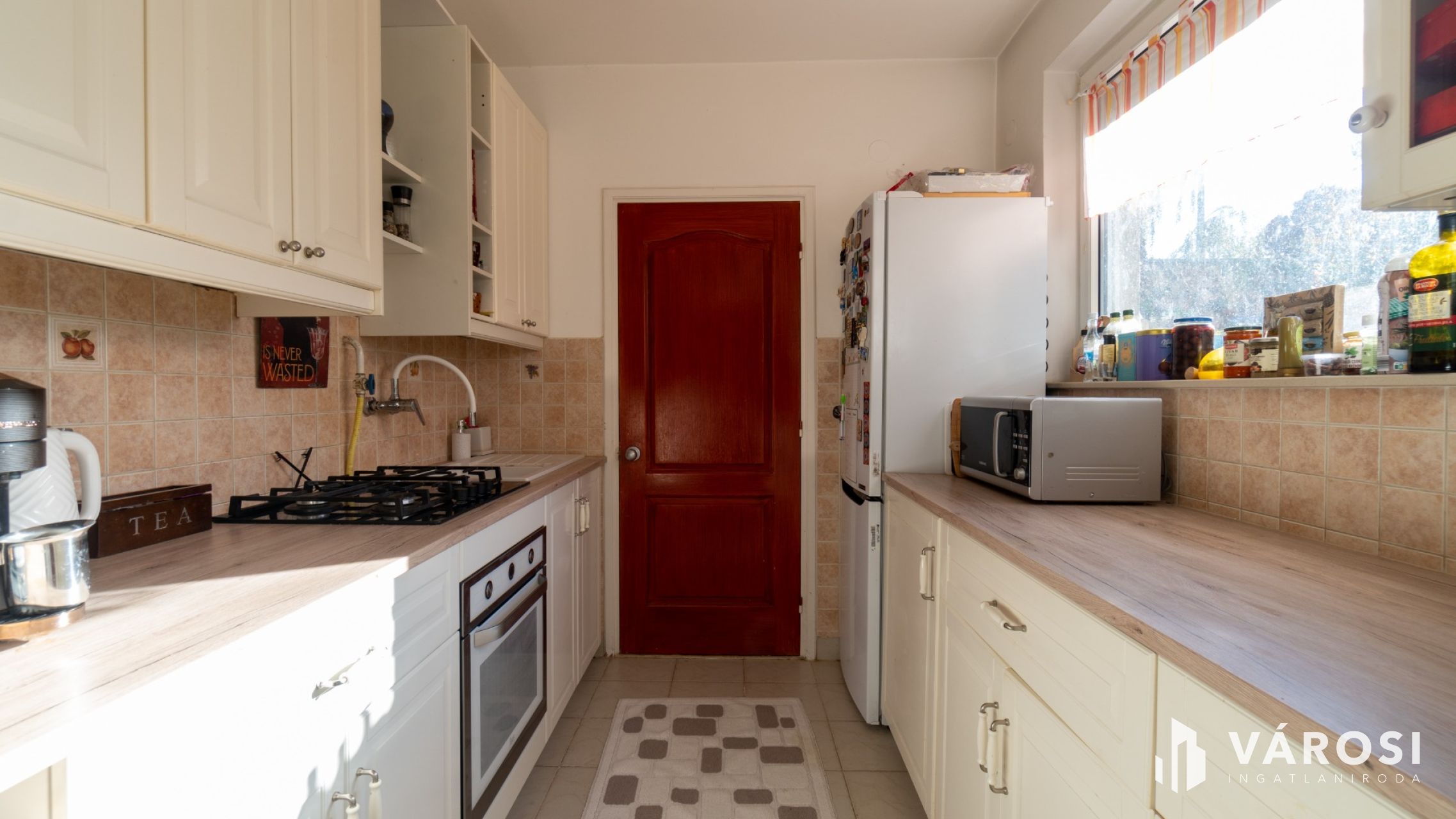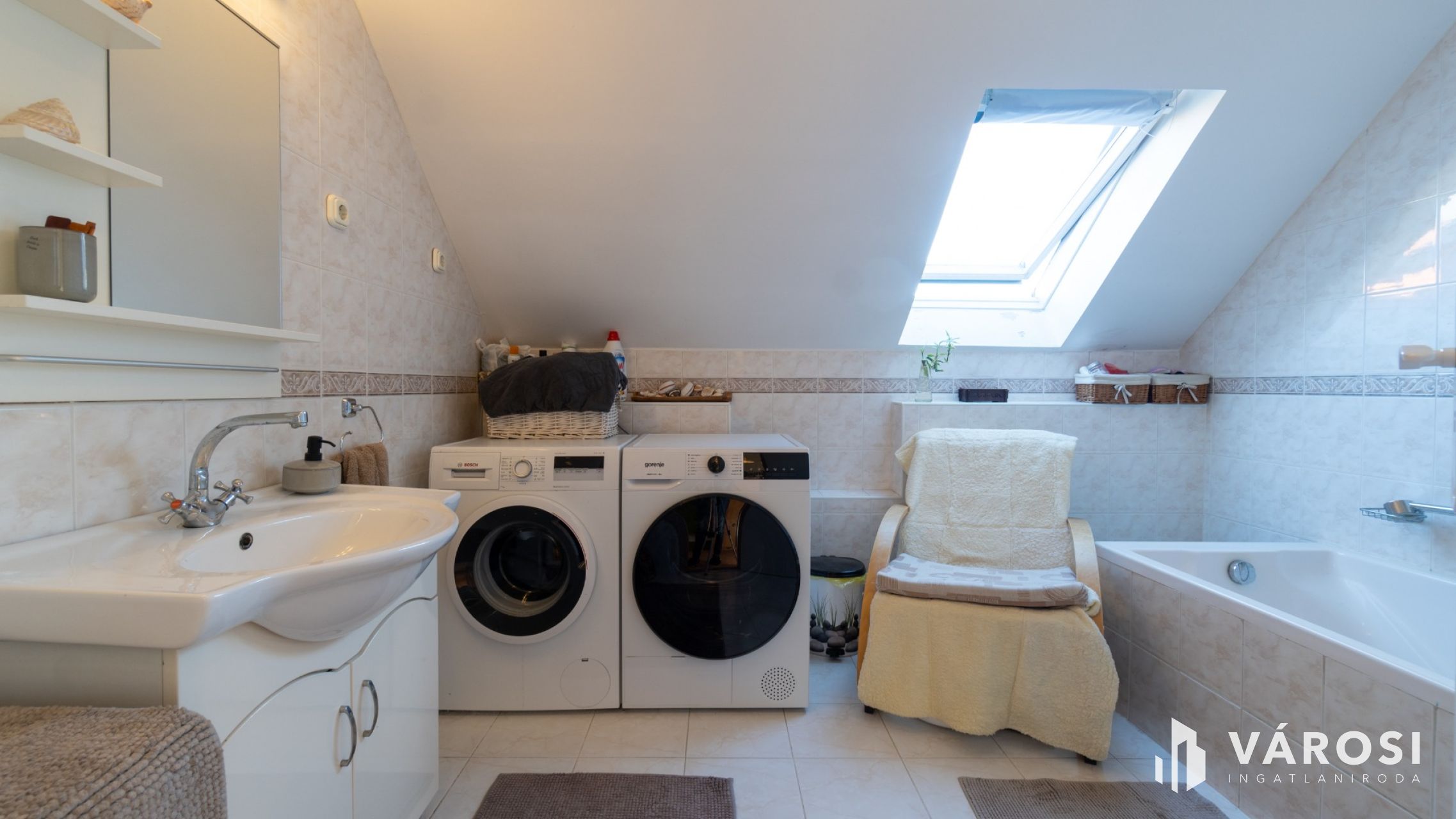 A három éve megújított, modern konyha gáz főzőlappal, elektromos sütővel és beépített mosogatógéppel felszerelt. A fürdőszobában a mosógép és a szárítógép is kényelmesen elfér. A melegvíz-ellátást és a fűtést gázkazán biztosítja.