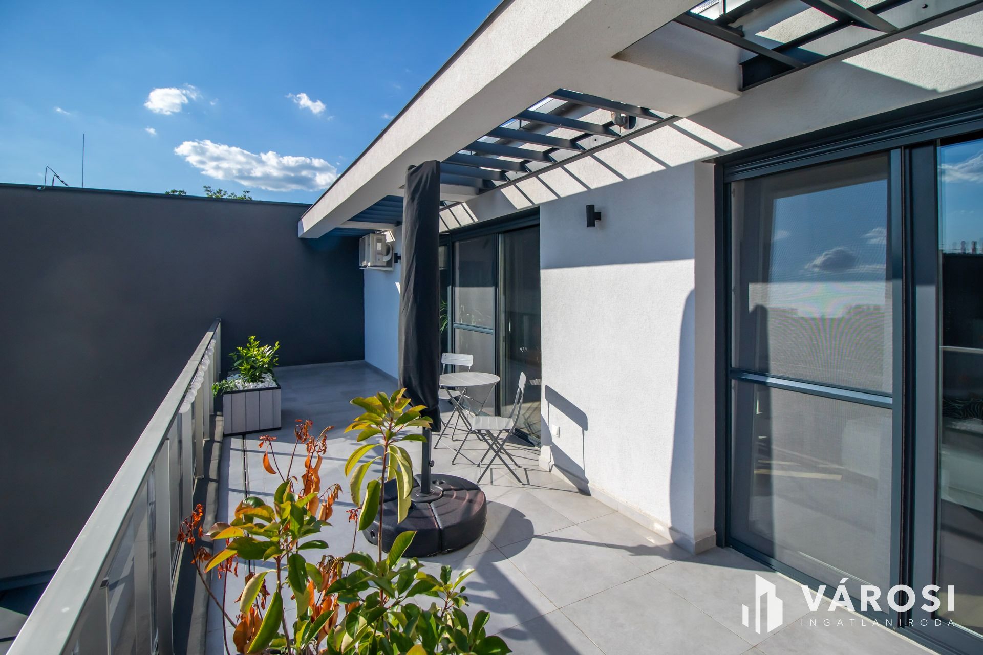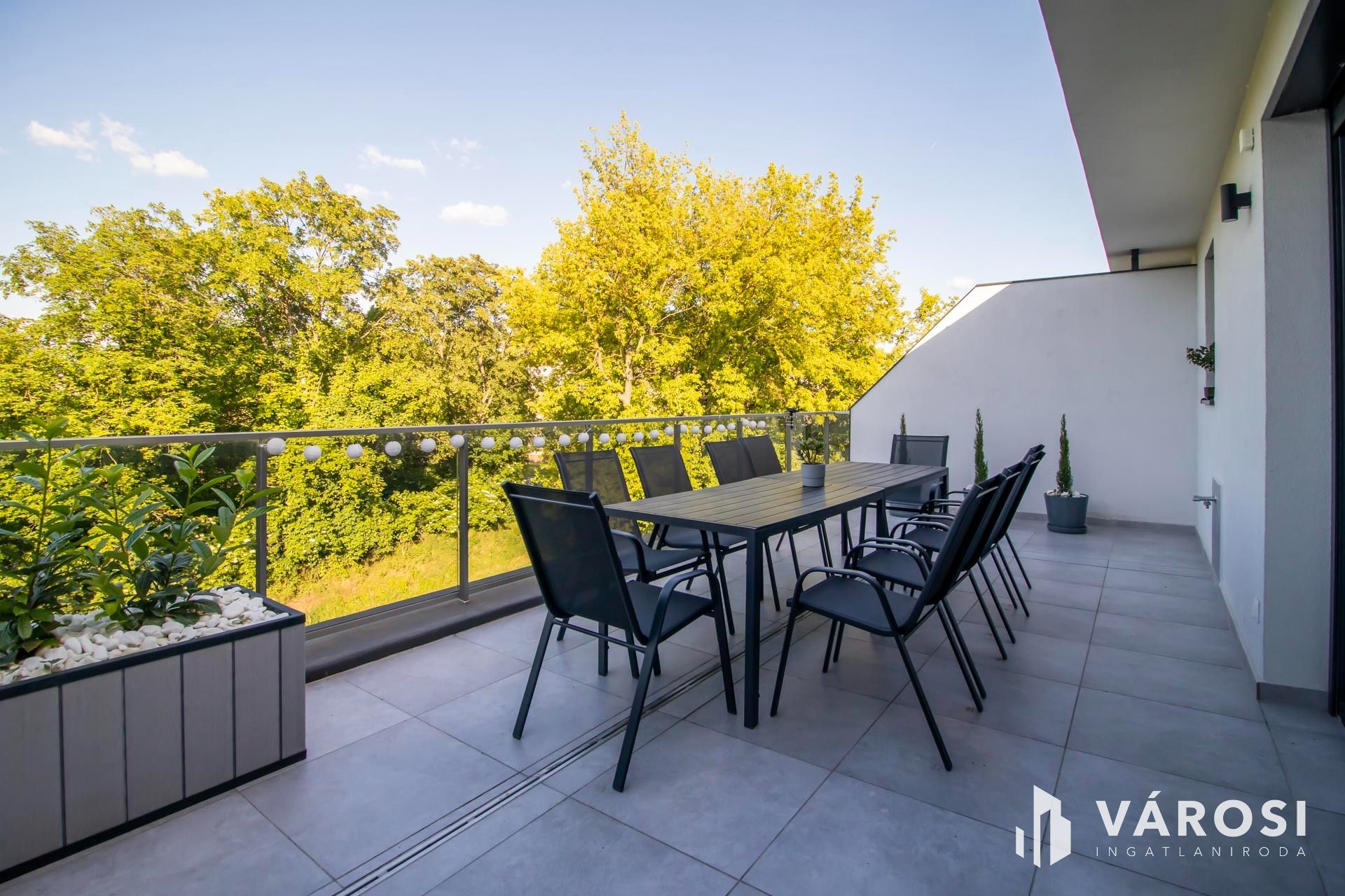A lakás kiemelkedő része a két hatalmas terasz. Az egyikről a napfelkeltét csodálhatjuk meg, akár reggelizés közben, miközben a ház melletti erdő fáin lakó madarak csicsergését hallgatjuk. A másik erkélyről a naplemente csodás fényeiben gyönyörködhetünk. A nyári nagy melegben mindig van egy olyan terasz, ahol árnyékban, vagy a napon lehetünk. Az egyik terasz statikailag alkalmas jacuzzi elhelyezésére is. A vízkiállás már ki van építve hozzá.