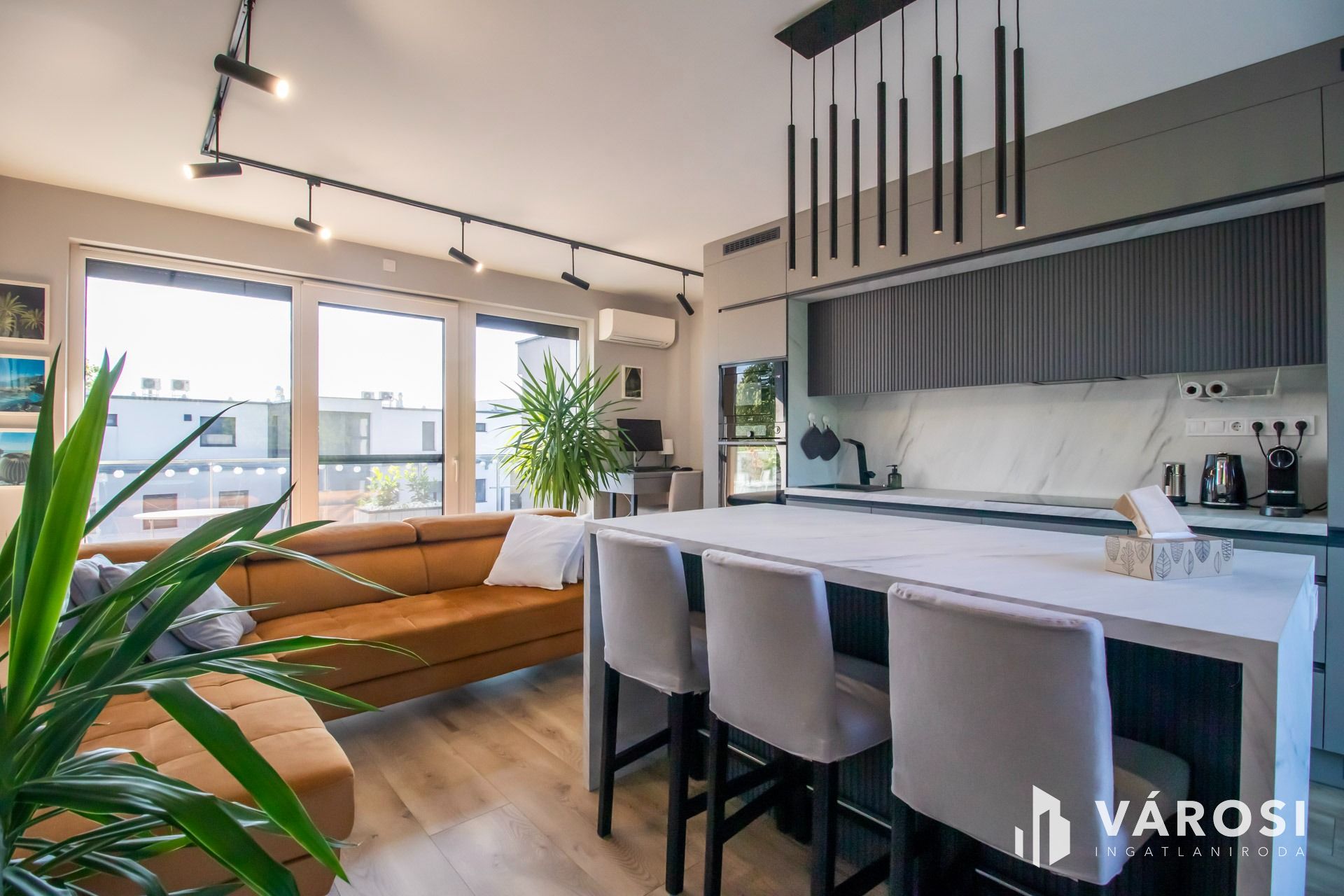 A konyhabútor is méretre készült és a legkorszerűbb gépekkel van felszerelve, amik természetesen itt maradnak szintén. A nappaliban igényes ülőgarnitúra csábít a pihenésre, tévézésre.