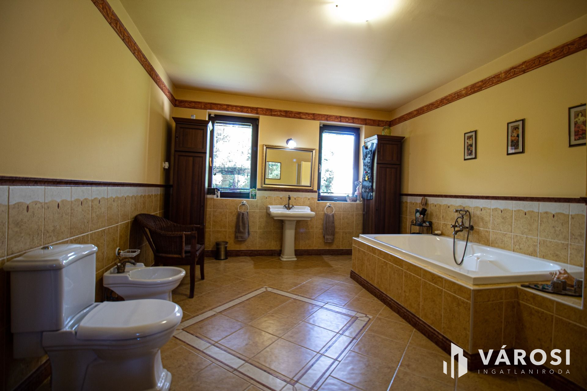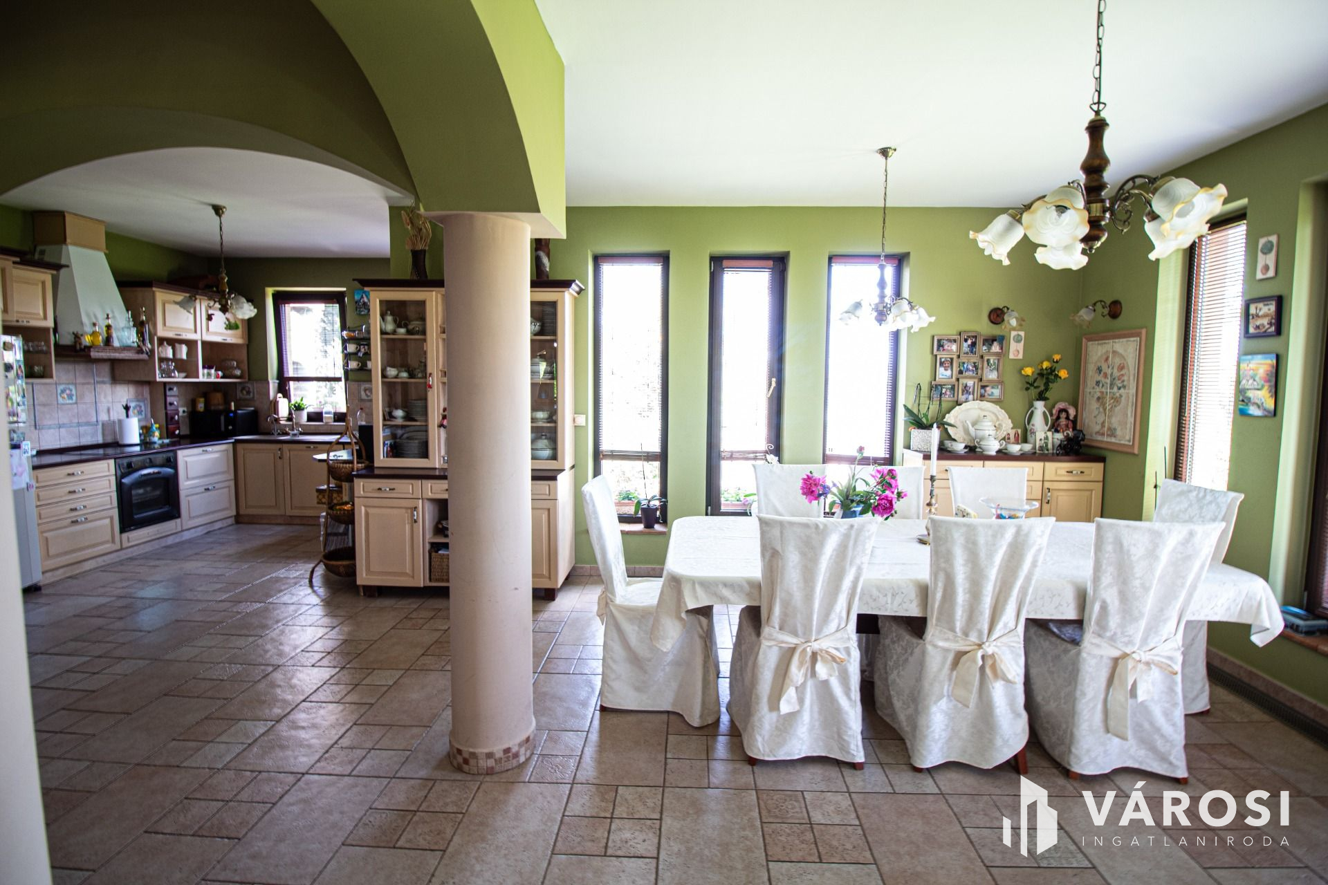 A tulajdonosok a megépítés során minden részletre odafigyeltek és a teljes építkezést felügyelték. A ház 38-as Phorotherm téglából épült, mely nemes vakolattal lett ellátva, a tető pedig Terrán héjazatot kapott. Az ingatlan belső kialakítását nézve a nagy terek dominálnak, hisz minden helyiség a nappaliból belátható. Az ingatlanba belépve egy szép, tágas előszobába érkezünk, mely térből már láthatóvá válik a belső szinteltolás is, ami szintén a mediterrán stílus jelképe. Ezen helyiségből továbbhaladva, tudjuk egy egyedi ívelt lépcsőn megközelíteni a felső szintet, amely 3 külön bejáratú szobából egy külön fürdőből és egy külön mellékhelyiségből áll. Mind 3 szobához teraszkapcsolat tartozik. Az alsó szintre visszatérve, található 2 külön bejáratú szoba, egy nagy légtérrel rendelkező nappali konyha étkező szintén teraszkapcsolatokkal. A ház tájolásának köszönhetően amely kelet-nyugat-dél a nap minden szakában a beltér fényáradatban úszik. A szigetelésről műanyag nyílászárok fa színben gondoskodnak. Az árnyékolást, exotikus gőzölt fa reluxák oldják meg. A meleg nyári napok lehűtésében, több beltéri klíma segédkezik. A hideg téli napok kifűtésében és a meleg víz előállításban, egy nagy teljesítményű cirkó kazán, használati melegvizes tartállyal összekapcsolva, radiátorokon és padlófűtésen keresztül gondoskodik, ezzel szolgálva a bent lakók kényelmét. A nappali hangulatát tovább fokozza, a központilag elhelyezett fa tüzelésű cserépkályha is amelynek melege, a fa ropogása szintén hozzájárul a lakrész téli nyugalmához. A ház belső hangulatát, a teraszra kilépve is érezhetjük, a felfuttatott szőlőnek és a szép igényes kertnek köszönhetően. A terasz adottságai nagyobb családi rendvények, partik megrendezésének tökéletes helyszíne. Gépkocsikkal való parkolás a dupla garázsban megoldott ami kapcsolatban van a belső lakrésszel is. A lakók biztonságára riasztó rendszer vigyáz, mely a nem kívánatos mozgás illetve ajtónyitás esetén azonnal jelez a távfelügyeleti cégnek.