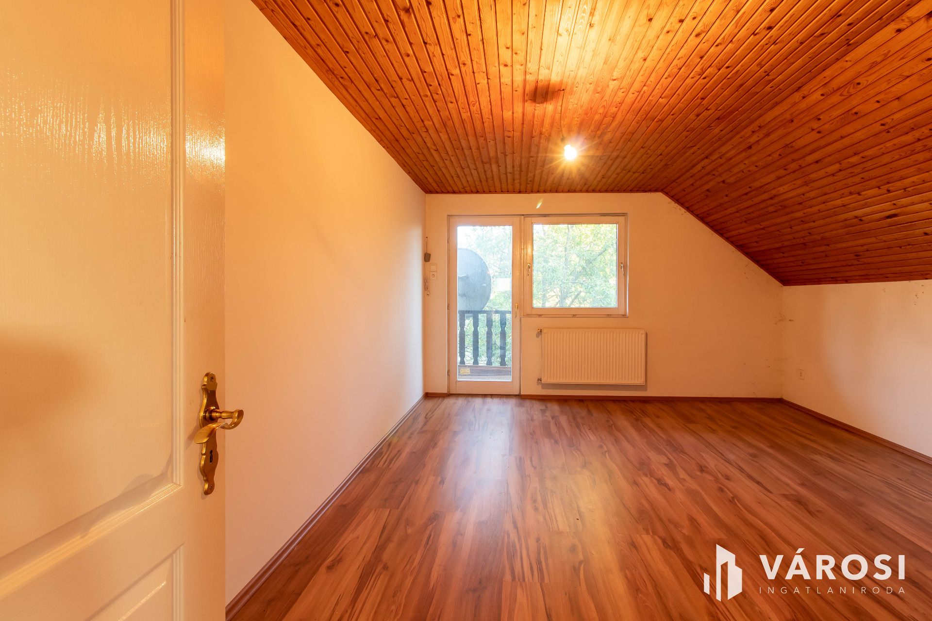 Az emelet szintén rendkívül világos és kényelmes elrendezésű. Itt található egy második fürdőszoba, külön WC, valamint három nagy méretű hálószoba. Kettő közülük teraszkapcsolattal rendelkezik, így a reggeli kávé vagy egy esti beszélgetés a teraszon igazi élményt nyújthat. A szobák laminált burkolata szinte teljesen új állapotban van, hiszen az ingatlan hosszabb ideje üresen állt.