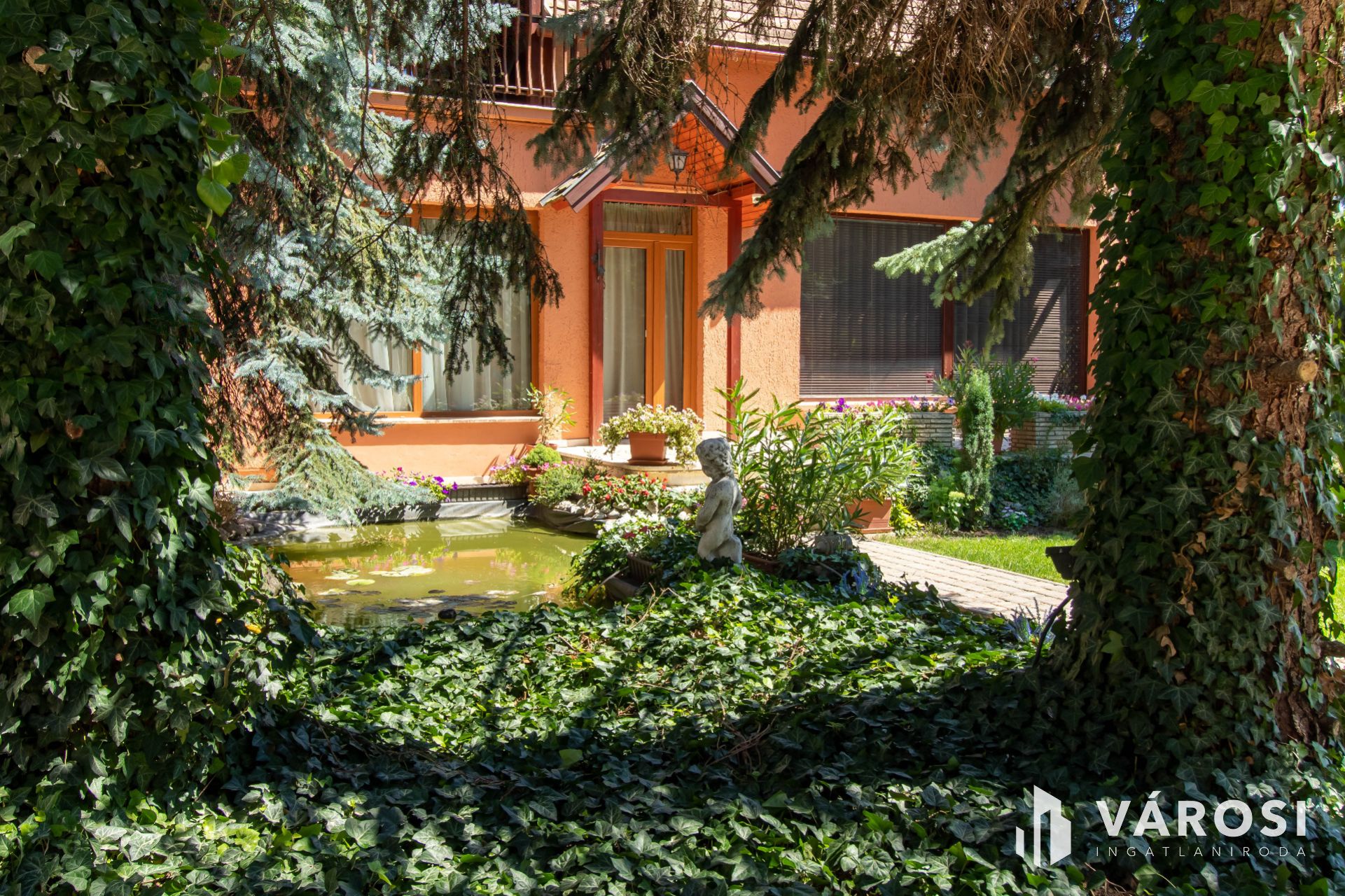 Gyönyörűen parkosított udvar örökzöldekkel, kerti tó, tágas világos napsütötte teraszok